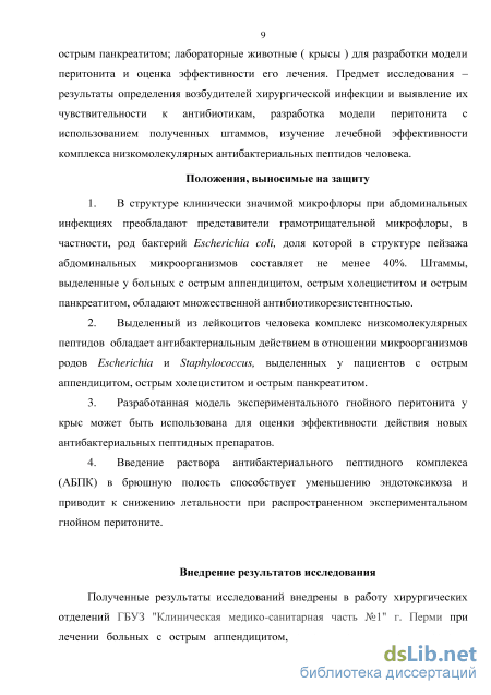 Проблема эффективного лечения гнойного перитонита на протяжении длительного времени сохраняет свою актуальность [121]. При распространенных формах перитонита возникают выраженные нарушения в состоянии основных защитных систем организма человека: иммунитета, гемостаза и неспецифической резистентности [32]. Важно отметить, что быстрое формирование резистентности бактерий к антибиотикам определяет экстренную необходимость поиска новых соединений не только среди продуктов химического синтеза, но и функционирующих в природных живых системах [49, 112]. Особое внимание исследователей привлекают низкомолекулярные катионные пептиды, обеспечивающие эффективную защиту про- и эукариотических организмов от бактериального окружения [63]. Антибактериальные пептиды, как правило, подавляют бактерии, невосприимчивые к распространенным в клинической практике антибиотикам. В последние годы успех в лечении многих заболеваний связан с терапией, основанной на применении лекарственных препаратов, являющихся естественными продуктами жизнедеятельности клеток и тканей процессов живых организмов. В Пермском НПО «Биомед» получен антибактериальный комплекс низкомолекулярных пептидов лейкоцитов, ассоциированный с процессом интерфероногенеза [27, 156]. Проведенные исследования in vitro по эффективности действия АБПК на микроорганизмы, выделенные из мочи детей с уроренальными инфекциями [67], а также его влияния на иммунную систему организма экспериментальных животных [80], свидетельствуют о необходимости дальнейшего широкого экспериментального изучения антибактериальных эффектов АБПК.