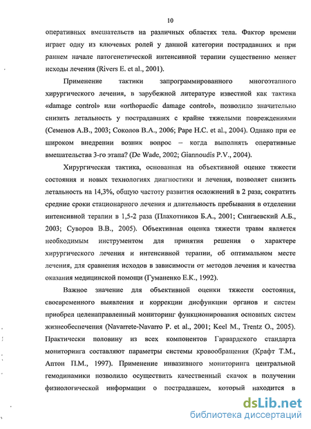 Одним из основных отечественных достижений последних десятилетий в проблеме тяжелых травм стало внедрение концепции травматической болезни (ТБ) в лечение пострадавших с тяжелыми травмами. С ее позиции' стало возможным объяснение и логическое построение причинно-следственных отношений между патологическими процессами в динамике, соотношений патологических и защитно-приспособительных процессов в каждом временном интервале (Селезнев С.А., Худайберенов Г.С., 1984; Дерябин И.И., Насонкин О.С, 1987; Ерюхин И.А., 1997). Она имеет научное клинико-патогенетическое обоснование и лежит в основе современной организации медицинской помощи и лечения пострадавших с тяжелыми сочетанными травмами (ТСТ) и политравмами (Селезнев С.А., Багненко С.Ф. с соавт., 2004; Гуманенко Е.К., 2006).