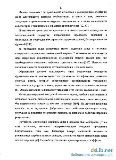 Коррекция возрастных изменений поверхностных мягких тканей лица и шеи сохраняют свою актуальность и на современном этапе развития пластической эстетической хирургии, не смотря на разработку большого числа способов устранения возрастных изменений [193, 347, 420]. В связи с этим создаются определенные трудности в правильной оценке преимуществ и недостатков того или иного метода [5, 31, 217]. Многообразие способов оперативных вмешательств и малоинвазивных процедур позволяет подойти к решению проблемы сугубо индивидуально [220].