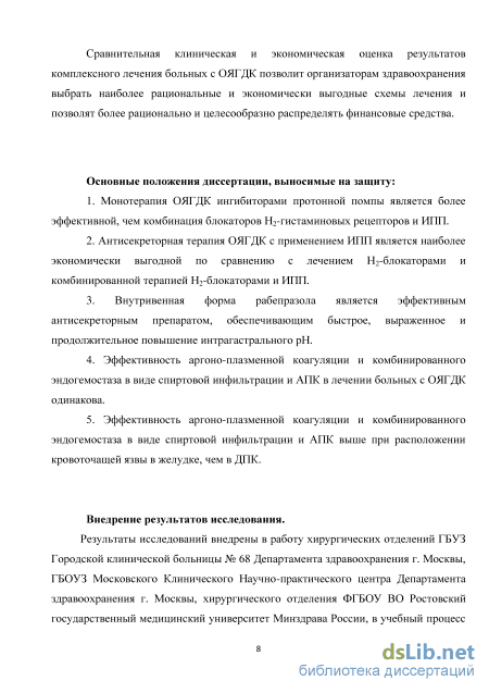 Заключительное исследование оценивало эффективность АПК в качестве монометода эндоскопической остановки кровотечения и комбинированного эндогемостаза в виде инфильтрации 30% спиртом и АПК. Установлено, что данные методы ЭГ обладают одинаковой эффективностью (р=0,656). При этом выявлено, что эффективность обоих методов ЭГ выше при расположении кровоточащей язвы в желудке, чем в ДПК. Это можно объяснить бльшим объемом желудка, лучшей визуализацией язвенного дефекта и большей свободой манипулирования по сравнению с ДПК. Полученные результаты диссертационного исследования позволяют улучшить клиническую эффективность комплексного лечения больных с острыми гастродуоденальными язвенными кровотечениями и сделать его более экономически выгодным.