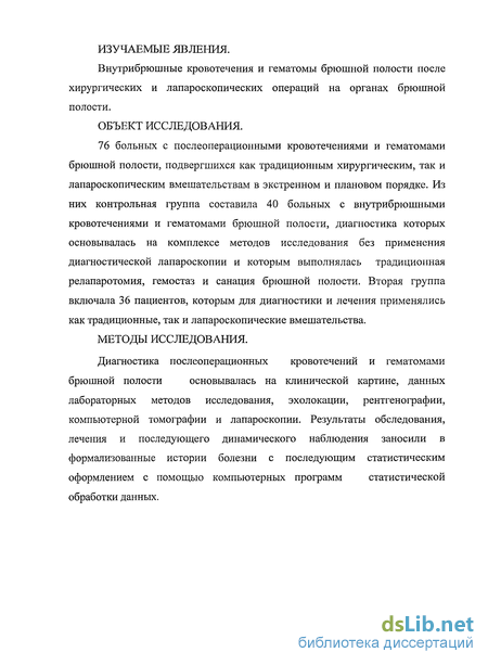 76 больных с послеоперационными кровотечениями и гематомами брюшной полости, подвергшихся как традиционным хирургическим, так и лапароскопическим вмешательствам в экстренном и плановом порядке. Из них контрольная группа составила 40 больных с внутрибрюшными кровотечениями и гематомами брюшной полости, диагностика которых основывалась на комплексе методов исследования без применения диагностической лапароскопии и которым выполнялась традиционная релапаротомия, гемостаз и санация брюшной полости. Вторая группа включала 36 пациентов, которым для диагностики и лечения применялись как традиционные, так и лапароскопические вмешательства.
