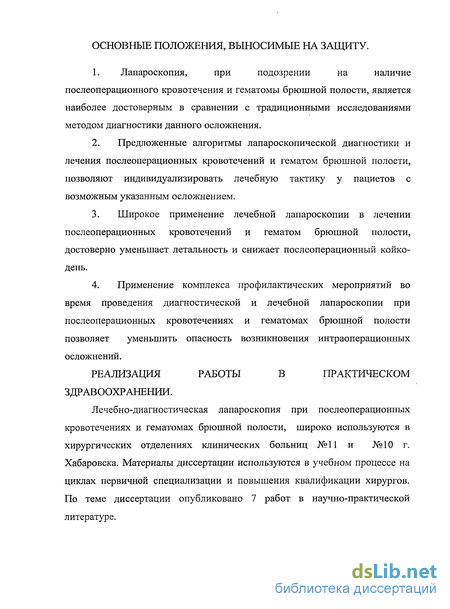 В связи с вышеизложенным, следует считать, что ряд вопросов касающихся лапароскопического метода, как метода диагностики и лечения послеоперационного кровотечения и гематом брюшной полости, остаются не достаточно изученными и требуют дальнейшей разработки.
