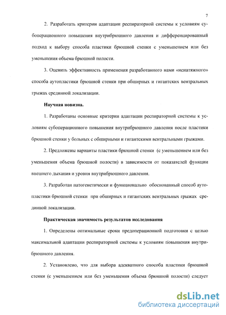 Разработать критерии адаптации респираторной системы к условиям субоперационного повышения внутрибрюшного давления и дифференцированный подход к выбору способа пластики брюшной стенки с уменьшением или без уменьшения объема брюшной полости.