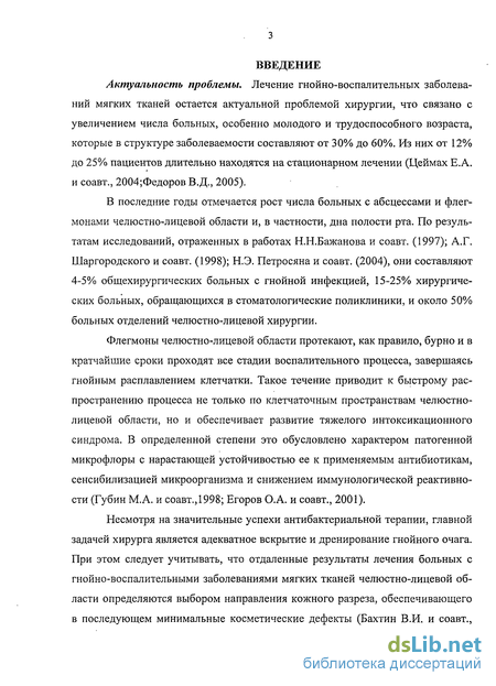 Актуальность проблемы. Лечение гнойно-воспалительных заболеваний мягких тканей остается актуальной проблемой хирургии, что связано с увеличением числа больных, особенно молодого и трудоспособного возраста, которые в структуре заболеваемости составляют от 30% до 60%. Из них от 12% до 25% пациентов длительно находятся на стационарном лечении (Цеймах Е.А. и соавт., 2004;Федоров В.Д., 2005).