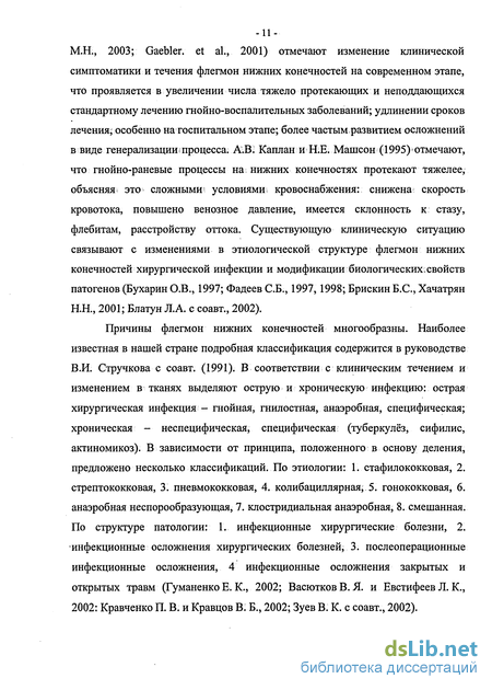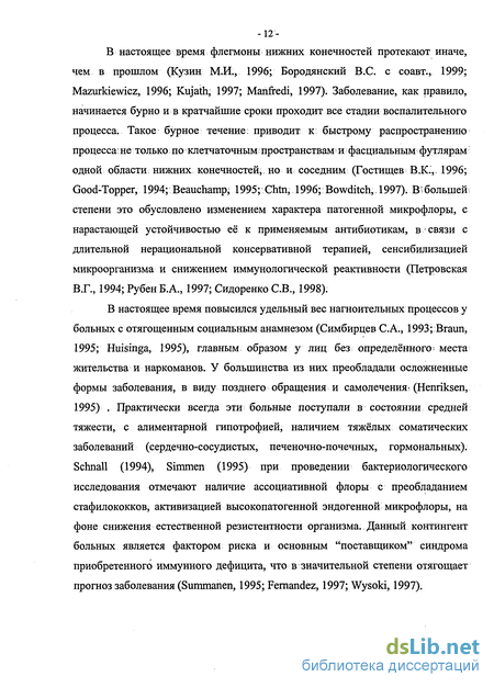 Анализ отечественной и зарубежной литературы свидетельствует, что трудности лечения гнойных заболеваний мягких тканей конечностей и, в \ частности, области голени в современных условиях обусловлены несколькими! причинами. К ним относятся и поздняя обращаемость больных за медицинской? помощью, изменения характера патогенной микрофлоры с нарастающей? устойчивостью ее к применяемым антибиотикам, необоснованно длительное: консервативное лечение, неправильное или недостаточно радикальное: первичное хирургическое вмешательство. При этом хирургами часто не учитывается и то; что одной из особенностей гнойно-воспалительных заболеваний является их свойство распространения по клетчаточным пространствам и фасциальным щелям с образованием гнойных затеков (Петровская В.Г., 1992; Горюнов А.И., 1990; Абросимов И.П., 1997; Рубен Б.А., 1997; Сидоренко СВ., 1998; Бабаджанов Р.Б., 1998; Elliott, 1996; Fernandes, 1997; Wysoki, 1997).