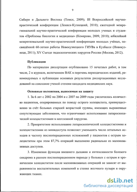 3. Впервые доказано, что изменения функции внешнего дыхания и интенсивность послеоперационного болевого синдрома после малоинвазивных холе- цистэктомий не зависят от вида малоинвазивного доступа и от выраженности воспалительных изменений в стенке желчного пузыря.
