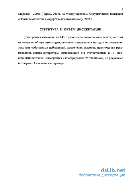 Диссертация изложена на 143 страницах машинописного текста, состоит из введения, обзора литературы, описания материалов и методов исследования, трех глав собственных наблюдений, заключения, выводов, практических рекомендаций, списка литературы, включающего 141 отечественный и 171 иностранный источник. Диссертация иллюстрирована 26 таблицами, 26 рисунками и содержит 3 клинических примера.