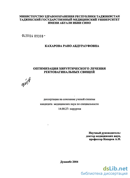 Кахарова Раъно Абдурауфовна. Оптимизация хирургического лечения ректовагинальных свищей : диссертация ... кандидата медицинских наук : 14.00.27 / Кахарова Раъно Абдурауфовна; [Место защиты: Таджикский государственный медицинский университет].- Душанбе, 2004.- 86 с.: ил.
