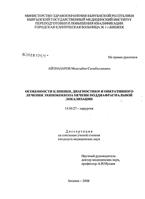 Актуальность проблемы. Эхшюкоккоз - паразитарное заболевагоге, распространенное во многих странах мира. Особенно велика заболеваемость в Центрально-Азиатском регионе и, что особенно важно, отмечается существенный рост заболеваемости, особенно в течение последних 15-20 лет (Ш.И.Каримов, 1994; М.А.Алиев и соавт., 1997; Т.О.Омурбеков и соавт., 2001; Б.А.Акмагов и соавт., 2002; Х.С.Бебезов и соавт., 2002; Б.С.Ниязов и соавт., 2002; Ж.О.Белеков и соавт., 2005).