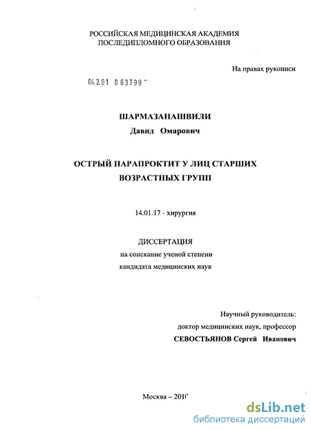 Специальных исследований возрастных особенностей течения и лечения острого парапроктита очень мало. Имеются только единичные наблюдения тяжелого течения особых, гнилостных форм парапроктита у старых и соматически отягощенных больных (Ю.Л.Мозель, 1973; И.М.Альф,1993) и о сочетании острого парапроктита с сахарным диабетом, так как больше половины больных были старше 60 лет (С.В.Ремизов,2005).