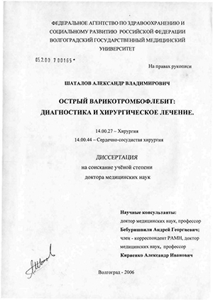 Шаталов Александр Владимирович. Острый варикотромбофлебит: диагностика и хирургическое лечение : диссертация ... доктора медицинских наук : 14.00.27 / Шаталов Александр Владимирович; [Место защиты: ГОУВПО "Волгоградский государственный медицинский университет"].- Волгоград, 2006.- 0 с.: ил.