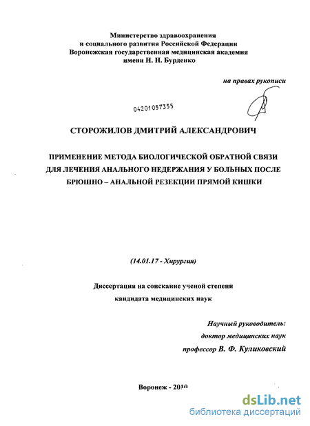 Изучение эффективности применения метода биологической обратной связи для лечения анального недержания у больных после брюшно–анальной резекции прямой кишки с низведением сигмовидной в анальный канал.