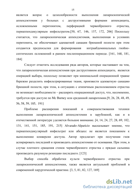 Проблеме расширения показаний и совершенствования техники выполнения лапароскопической аппендэктомии в зарубежной, как и в отечественной литературе уделяется большое внимание. [4, 14, 24, 27, 28, 69, 102, 131, 141, 151, 185, 191, 215] Alvarado-Alparicio высказывает мнение, что периаппендикулярный инфильтрат или абсцесс не является показанием к выполнению конверсии доступа. Автор предлагает при получении гноя аспирировать последний и производить аппендэктомию от основания. При этом, в случае плотного сращения стенок червеобразного отростка с прядью сальника производить разумную резекцию последнего. [123]