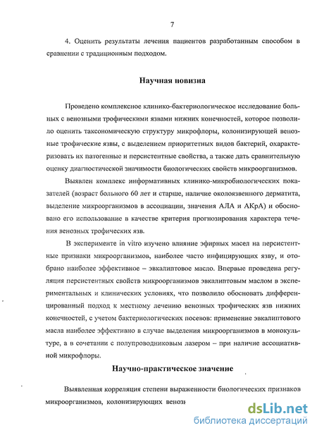 нечностей, и длительности заживления последних, расширяет представления о роли микробного фактора в течении язв и позволяет обосновать дополнительный критерий при подборе более интенсивного лечения. Практическое значение работы подтверждено разработкой способа местного лечения венозных трофических язв нижних конечностей (положительное решение формальной экспертизы по заявке на изобретение № 2007147295/14(051837).