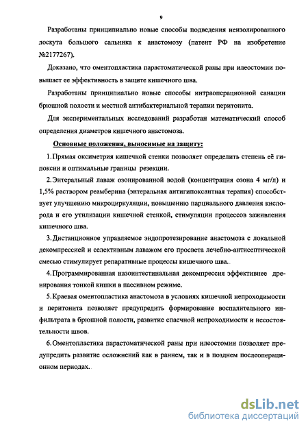 Внедрение результатов работы. Разработаны и внедрены в хирургическую практику патенты на изобретения и методические рекомендации по назоинтестинальной интубации, санации брюшной полости и оментопластике анастомоза.