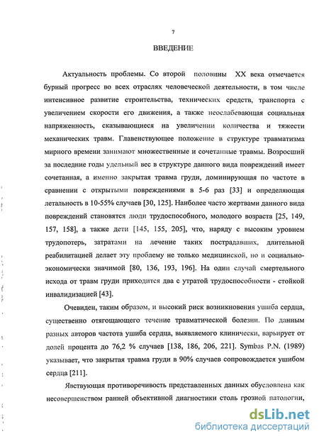 Кроме этого, ошибки в диагностике закрытых травм груди, встречающиеся от 35,2-40,0% [33] до 71,0-80,2% [79, 82] случаев, обусловлены как сложностью механизма и сочетанным характером травмы, так и, зачастую, несоответствием внешне незначительных изменений тяжелым внутригрудным повреждениям. Своеобразие вариантов клинического течения, разногласия в вопросах трактовки и, вообще, существования понятия ушиба сердца, отсутствие единства, целостности в представлении о данной патологии, ее месте и огромной значимости при определении исхода травматической болезни [148, 149, 162, 190, 198, 199] диктуют необходимость тщательного изучения данной проблемы.