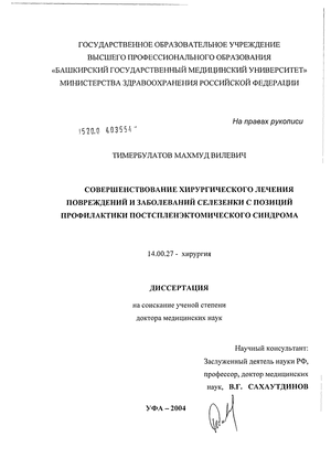Цель и задачи исследования. Целью настоящей работы является разработка принципов профилактики постспленэктомического синдрома путем внедрения комплекса диагностических и лечебных мероприятий в клиническую практику лечения больных с травмами и заболеваниями селезенки и повышения эффективности традиционных методов.
