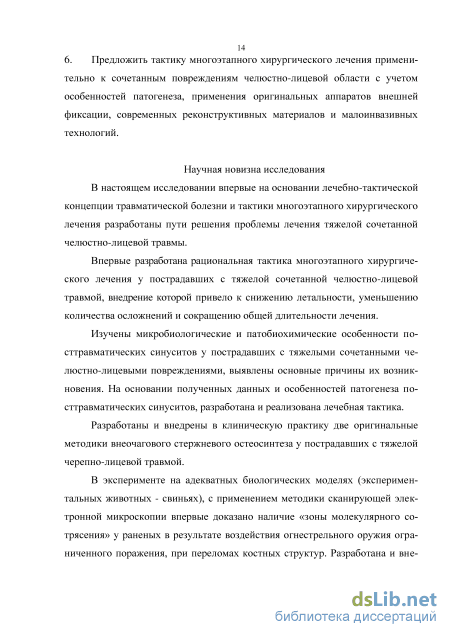 4. Рациональное лечение сочетанных повреждений челюстно-лицевой области должно основываться на использовании принципов лечебно-тактической концепции травматической болезни и тактики многоэтапного хирургического лечения. Применение разработанной лечебной тактики, оригинальных аппаратов для внеочагового остеосинтеза, использование малоин-вазивных методов лечения и современных реконструктивных материалов позволяет существенно улучшить результаты лечения пострадавших с тяжелой сочетанной челюстно-лицевой травмой в многопрофильном стационаре. Степень достоверности результатов исследования В ходе выполнения исследования был использован комплекс современных и оригинальных методов и способов сбора и обработки первичной информации, формирования репрезентативных выборок с подбором объектов наблюдения. Достоверность научных положений, выводов и практических рекомендаций обеспечены структурно-системным подходом, обширностью и разнообразием проанализированного материала за длительный период и применением адекватных методов математико-статистической обработки данных. На достаточно большом фактическом материале с анатомо-физиологических, структурно-морфологических, микробиологических, пато-биохимических, патогенетических и хирургических позиций рассмотрены вопросы лечения тяжелых сочетанных механических и огнестрельных повреждений челюстно-лицевой области, что позволило обосновать, разработать и внедрить основополагающие методы лечения в динамике развития травматической болезни у пострадавших с тяжелыми повреждениями лица и челюстей.