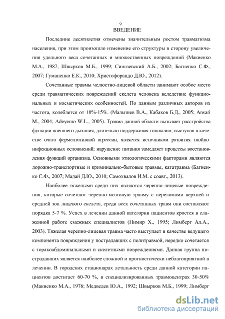 Данные литературы свидетельствуют о том, что лечение сочетанных челюстно-лицевых и черепно-лицевых повреждений является сложной междисциплинарной проблемой. Тяжелые последствия сочетанной черепно-лицевой травмы являются причиной выделения подобной травмы в число социальной проблемы государственного и мирового значения. Весомый вклад в разработку проблемы внесли ряд отечественных (Макиенко М.А., Швырков М.Б., Малышев В.А., Кабаков Б.Д., Лимберг Ал.А., Соловьев М.М., Козлов В.А., Фаизов Ф.Ф., Бобылев А.Г., Прохватилов Г.И., Лукьяненко А.В., Мадай Д.Ю.) и зарубежных ученых (Adeyemo W.L., Ansari M., Iida S., Down K.E., Bynoe R.P., Chen Y.F.,West G.A.).