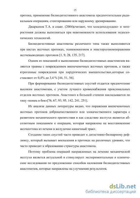 Тарасюк Т.П. и Вишневский В.А.(2003) отмечают, что при обтураци-онной желтухе, причиной которой явилось поражение опухолью жёлчного 15 протока, применение билиодигестивного анастомоза предпочтительнее радикальным операциям, стентированию или наружному дренированию.