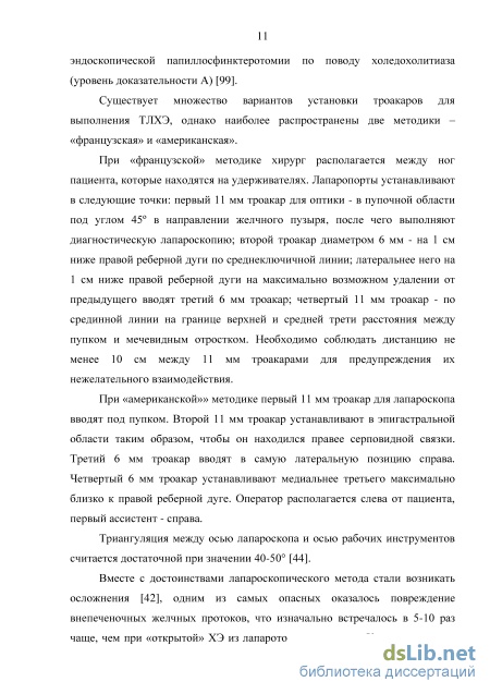 При «французской» методике хирург располагается между ног пациента, которые находятся на удерживателях. Лапаропорты устанавливают в следующие точки: первый 11 мм троакар для оптики - в пупочной области под углом 45 в направлении желчного пузыря, после чего выполняют диагностическую лапароскопию; второй троакар диаметром 6 мм - на 1 см ниже правой реберной дуги по среднеключичной линии; латеральнее него на 1 см ниже правой реберной дуги на максимально возможном удалении от предыдущего вводят третий 6 мм троакар; четвертый 11 мм троакар - по срединной линии на границе верхней и средней трети расстояния между пупком и мечевидным отростком. Необходимо соблюдать дистанцию не менее 10 см между 11 мм троакарами для предупреждения их нежелательного взаимодействия.
