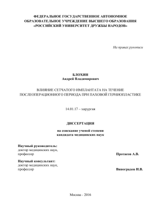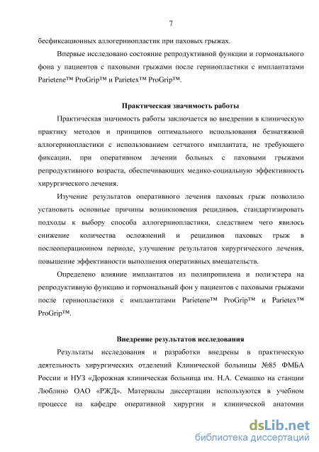 Диссертационная работа основывается на исследовании результатов хирургического лечения пациентов с паховыми грыжами, оперированных в период с 2010 по 2015 год на клинической базе кафедры оперативной хирургии и клинической анатомии им. И.Д.Кирпатовского медицинского института РУДН и кафедры андрологии ФПКМР медицинского института РУДН – в отделении хирургии Клинической Больнице № 85 ФМБА России и в отделении хирургии и урологии и НУЗ «Дорожная клиническая больница им. Н.А. Семашко на станции Люблино ОАО «РЖД».