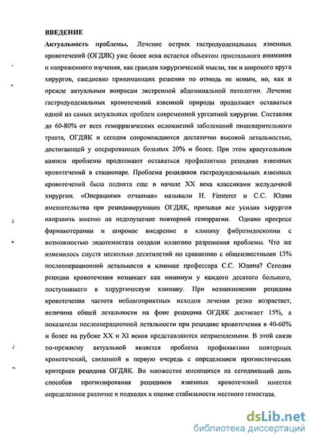 Актуальность проблемы. Лечение гастродуоденальных кровотечении язвенной природы продолжает оставаться одной из самых актуальных проблем современной ургентной хирургии. Составляя до 60-80% от всех геморрагических осложнений заболеваний пищеварительного тракта, острые гастродуоденальные язвенные кровотечения и сегодня сопровождаются достаточно высокой летальностью, достигающей у оперированных больных 20%. (Э.В.Луцевич, 2003, Л.Н. Бисенков , 2002, И.И. Затевахин 2000, J.Lau,2000) При этом краеугольным камнем проблемы продолжают оставаться профилактика рецидива язвенных кровотечений в стационаре. При возникновении рецидива кровотечения частота неблагоприятных исходов лечения резко возрастает. При рецидиве кровотечения летальность достигает 40%. (В.К. Гостищев, 2004, ВТ. Вербицкий, 2004, N. Church, 2003, G.Cooper, 1999)
