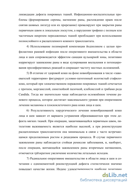 В конечном счте, надо полагать, что совокупное решение перечисленных проблем, связанных с особенностями развития раневого процесса и заживления послеоперационной раны, позволит улучшить результаты хирургического лечения новообразований кожи головы и шеи, в том числе повысить качество жизни этой категории пациентов.
