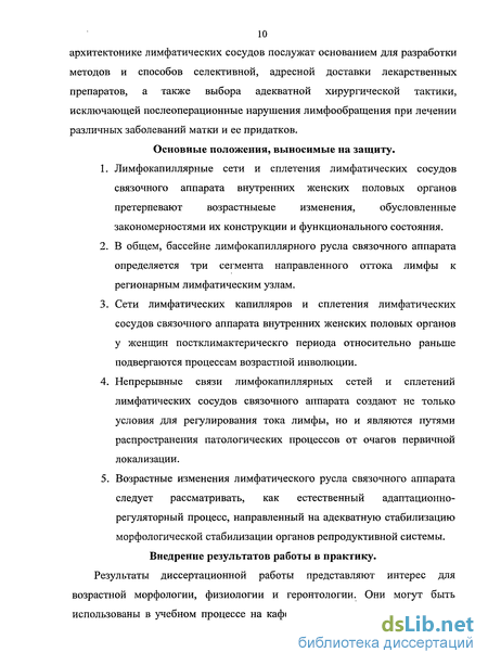 5 изменениях сетей их лимфатических капилляров и сплетений лимфатических сосудов их связочного аппарата, представляют не только теоретический интерес, но и имеют определённое прикладное значение для клиники. Увеличение хирургической активности на органах женского малого таза, в связи с успехами диагностики их заболеваний и лечения, требует точных данных о закономерностях формирования и особенностях строения путей поэтапного оттока лимфы. Эти задачи приобретают важное практическое значение и в связи с требованиями гинекологии детского возраста и гериартрической гинекологии. Существенным моментом здесь также являются перспективы специализированной индивидуальной помощи больным в детском, подростковом, зрелом и пожилом возрасте.