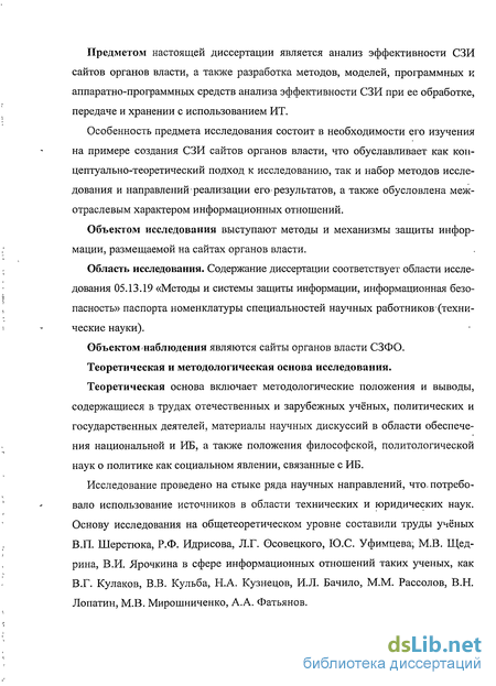 Предметом настоящей диссертации является анализ эффективности СЗИ сайтов органов власти, а также разработка методов, моделей, программных и аппаратно-программных средств анализа эффективности СЗИ при ее обработке, передаче и хранении с использованием ИТ.