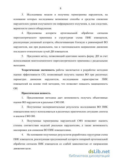 Теоретическая значимость работы заключается в разработке методики оценки эффективности СО, позволяющей получить оценки ВО при различных параметрах движения нарушителя, и исследовании характеристик ПИК извещателей на основе этой методики, что позволяет повысить защищенность ОИ.