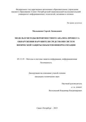 В настоящей диссертационной работе предлагаются модель и методы вероятностного анализа процесса обнаружения нарушителя средствами СФЗ объектов информатизации.