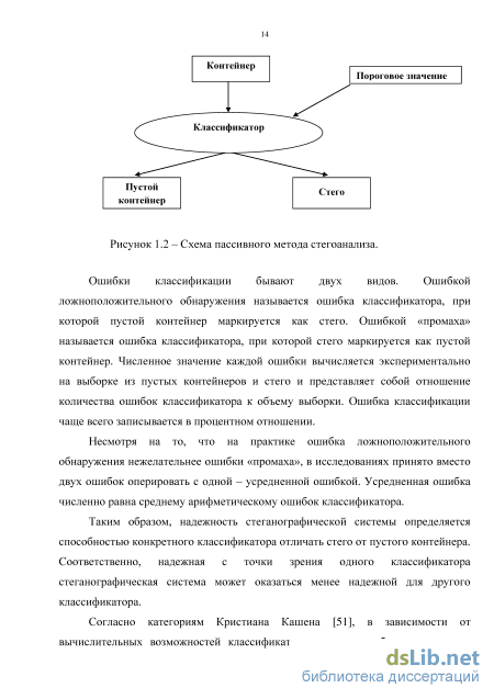 Основной характеристикой стеганографической системы является надежность [50]. Надежность - способность стеганографической системы противодействовать методам стегоанализа, нацеленным на обнаружение скрытой информации в контейнере. Если подходить к проблематике надежности более формально, то метод стегоанализа представляет собой классификатор - алгоритм, входным значением которого является исследуемый контейнер, а выходным значением - соответствующая маркировка, стего или пустой контейнер. В большинстве классификаторов есть ещё один входной параметр, задаваемый аналитиком. Это порог, или пороговое значение, которое определяет чувствительность классификатора к ошибкам классификации (рисунок 1.2). ложноположительного обнаружения называется ошибка классификатора, при которой пустой контейнер маркируется как стего. Ошибкой «промаха» называется ошибка классификатора, при которой стего маркируется как пустой контейнер. Численное значение каждой ошибки вычисляется экспериментально на выборке из пустых контейнеров и стего и представляет собой отношение количества ошибок классификатора к объему выборки. Ошибка классификации чаще всего записывается в процентном отношении.