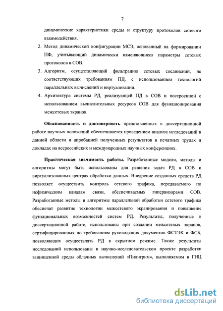 Практическая значимость работы. Разработанные модели, методы и алгоритмы могут быть использованы для решения задач РД в СОВ и виртуализованных центрах обработки данных. Внедрение созданных средств РД позволяет осуществить контроль сетевого трафика, передаваемого по нефизическим каналам связи, обеспечиваемых пшервизорами СОВ. Разработанные методы и алгоритмы параллельной обработки сетевого трафика обеспечат развитие технологии межсетевого экранирования и повышение функциональных возможностей систем РД. Результаты, полученные в диссертационной работе, использованы при создании межсетевых экранов, сертифицированных по требованиям руководящих документов ФСТЭК и ФСБ, позволяющих осуществлять РД в скрытном режиме. Также результаты исследований использованы в научно-исследовательском проекте разработки защищенной среды облачных вычислений «Пилигрим», выполняемом в ГНЦ «ЦНИИ РТК» и при выполнении НИР на кафедре телематики ФГБОУ ВПО «СПбГПУ».
