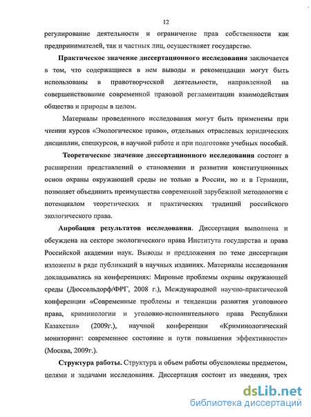 Новизна диссертационного исследования. Диссертационная работа представляет собой основанное на теоретических положениях комплексное сравнительно-правовое исследование основ охраны окружающей среды в российском и германском законодательстве применительно к современным динамичным условиям. Результаты диссертационного исследования заключаются:
