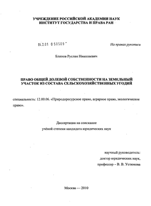 И; В: Кундуховой в 2008 году защищена кандидатская диссертация на тему: «Правовое регулирование общей долевой собственности на земельные участки из земель сельскохозяйственного* назначения на примере Г Республики Северная Осетия-Алания»; Однако в данной работе рассматривались лишь возможные правовые и экономические последствия внедрения отношений общей долевой собственности на землю в Республике Северная Осетия — Алания,, а также частично —:- общетеоретические вопросы определения значения общей долевой собственности в процессе формирования^ системы земельных отношений в России: