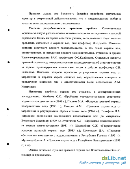 Степень разработанности правовых проблем. Отечественная юридическая наука уделяла немало внимания вопросам исследования правовой охраны вод. Одним из первых советских ученых, исследовавших теоретические проблемы, связанные с охраной вод, был профессор Л.И.Дембо. Сложные вопросы советского водного законодательства, в том числе охраны вод, ответственность за нарушение водного законодательства, отражены в трудах Члена-корреспондента РАН, профессора О.С.Колбасова. Отдельные аспекты правовой охраны вод, совершенствования законодательства об ответственности за водные правонарушения нашли свое место в работах профессора СБ. Байсалова. Основные вопросы правового регулирования охраны вод от загрязнения и порядка сброса сточных вод, осуществления контроля и привлечения виновных лиц к ответственности были исследованы A.M. Кавериным.