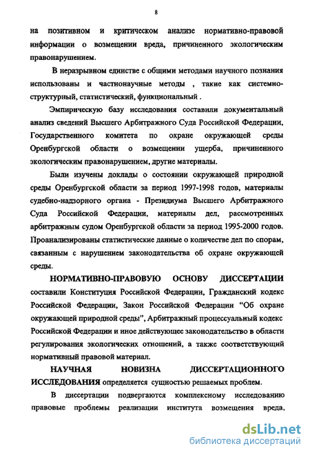 НОРМАТИВНО-ПРАВОВУЮ ОСНОВУ ДИССЕРТАЦИИ составили Конституция Российской Федерации, Гражданский кодекс Российской Федерации, Закон Российской Федерации "Об охране окружающей природной среды", Арбитражный процессуальный кодекс Российской Федерации и иное действующее законодательство в области регулирования экологических отношений, а также соответствующий нормативный правовой материал.