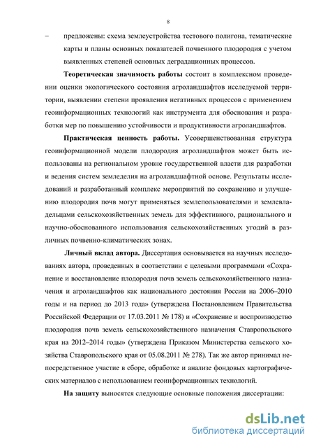 Личный вклад автора. Диссертация основывается на научных исследованиях автора, проведенных в соответствии с целевыми программами «Сохранение и восстановление плодородия почв земель сельскохозяйственного назначения и агроландшафтов как национального достояния России на 2006–2010 годы и на период до 2013 года» (утверждена Постановлением Правительства Российской Федерации от 17.03.2011 № 178) и «Сохранение и воспроизводство плодородия почв земель сельскохозяйственного назначения Ставропольского края на 2012–2014 годы» (утверждена Приказом Министерства сельского хозяйства Ставропольского края от 05.08.2011 № 278). Так же автор принимал непосредственное участие в сборе, обработке и анализе фондовых картографических материалов с использованием геоинформационных технологий.