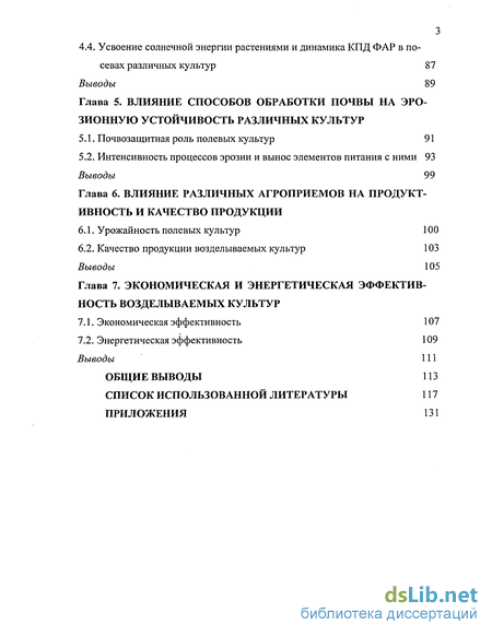 Исследования по фотосинтетической деятельности посевов полевых культур позволяют сделать следующие выводы: 1. Безотвальная обработка почвы приводила к незначительному сниже нию высоты растений. К концу вегетации разница на вариантах с естествен ным плодородием составила 9,1% (овес + вика), 7,3% (оз. рожь) и 11,2% (кар тофель). Наибольший прирост установлен в период времени от фазы выхода в трубку до колошения, который на неудобренных вариантах с вико-овсяной смесью составил 61,3 - 54,0 см, а при внесении органо-минеральных удобрений 67,4 - 62,4 см. В посевах озимой ржи показатели были выше на 33,2-35,8 см. 2. Наибольшую листовую поверхность однолетняя травосмесь из овса (колошение) и вики (бутонизация) формировала на удобренных вариантах, которая составила 39,44 - 42,33 тыс. м /га, что на 30,8 - 31,0% больше, чем без удобрений. Относительно низкие показатели фотосинтетической деятельности были отмечены на вариантах с картофелем. При этом максимального значения листовая поверхность достигала в фазе цветения, которая со-ставила 23,64 и 21,22 тыс. м /га. 3. Наивысший суммарный фотосинтетический потенциал отмечен на посевах с озимой рожью: на неудобренном фоне он составил 1,476 млн. м2/гахдни, а при внесений удобрений - 1,749 млн. м2/гахдни, что на 85,7-119,0% выше по сравнению с вико-овсяной травосмесью и картофелем. 4. Наибольшее количество сухого вещества накапливалось в посевах озимой ржи. На неудобренных вариантах с отвальной обработкой почвы к фазе колошения формировалось 68,39 ц/га биомассы, к концу вегетации -102,69 ц/га, а на безотвальной - на 7,43 ц/га меньше. 5. В среднем за вегетацию показатели ЧПФ у вико-овсяной смеси, озимой ржи и картофеля при отвальной обработке почвы были выше на 2,8; 3,2; 5,5% (без удобрений) и 4,7; 5,0; 6,1% (удобренные) по сравнению с чизелева-нием. Первый пик ЧПФ в посевах вико-овсяной смеси, озимой ржи отмечался в фазе колошения и на неудобренных вариантах она составила 7,30 - 7,00 и 7,95 - 7,83 г/м хсутки, а у картофеля в фазе цветения - 9,76 - 9,18 г/м хсутки. Показатель ЧПФ во втором пике оказался выше. На удобренных вариантах с озимой рожью составила 18,29 - 17,30 г/м2хсутки, что на 12,3 - 13,1% больше, чем у картофеля. 6. Исследуемые культуры имели хороший КПД ФАР (1,5-3,0%), а посевы озимой ржи на удобренном фоне рекордные значения (3,61 - 3,29%). Применение удобрений повышало КПД у исследуемых растений в среднем на 1,68% (вико-овсяная смесь), 1,58% (оз. рожь), 1,71% (картофель). Для разработки эффективных, научно обоснованных систем земледелия для районов с развитой водной эрозией чрезвычайно важен вопрос оптимизации структуры посевных площадей. Основой его решения является оценка почвозащитной способности полевых культур. В конечном итоге набор и размещение культур должны обеспечить максимальную защиту почв от эрозии.
