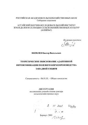 Яковлев Виктор Васильевич. Теоретическое обоснование адаптивной интенсификации полевого кормопроизводства Западной Сибири : диссертация ... доктора сельскохозяйственных наук : 06.01.01.- Барнаул, 2001.- 318 с.: ил. РГБ ОД, 71 01-6/118-4