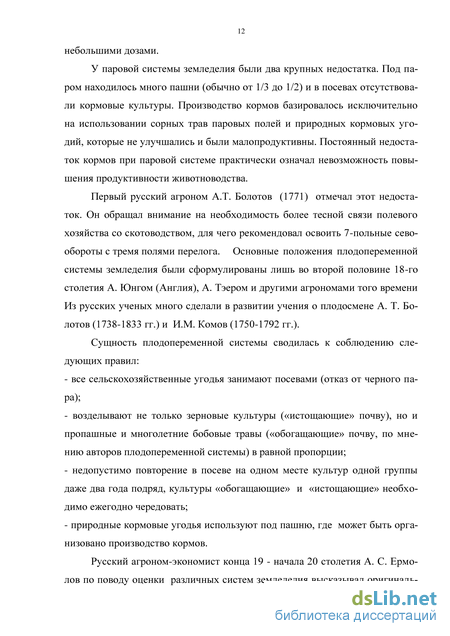 Первый русский агроном А.Т. Болотов (1771) отмечал этот недостаток. Он обращал внимание на необходимость более тесной связи полевого хозяйства со скотоводством, для чего рекомендовал освоить 7-польные севообороты с тремя полями перелога. Основные положения плодопеременной системы земледелия были сформулированы лишь во второй половине 18-го столетия А. Юнгом (Англия), А. Тэером и другими агрономами того времени Из русских ученых много сделали в развитии учения о плодосмене А. Т. Болотов (1738-1833 гг.) и И.М. Комов (1750-1792 гг.). Сущность плодопеременной системы сводилась к соблюдению следующих правил: - все сельскохозяйственные угодья занимают посевами (отказ от черного пара); - возделывают не только зерновые культуры («истощающие» почву), но и пропашные и многолетние бобовые травы («обогащающие» почву, по мнению авторов плодопеременной системы) в равной пропорции; - недопустимо повторение в посеве на одном месте культур одной группы даже два года подряд, культуры «обогащающие» и «истощающие» необходимо ежегодно чередовать; - природные кормовые угодья используют под пашню, где может быть организовано производство кормов. Русский агроном-экономист конца 19 - начала 20 столетия А. С. Ермолов по поводу оценки различных систем земледелия высказывал оригинальные мысли. Сущность их сводилась к тому, что нет не безусловно хороших, не безусловно плохих систем земледелия, каждая система земледелия хороша, если она соответствует времени, местным условиям и обеспечивает чистый доход (Ермолов, 1901; Крохалев, 1960).
