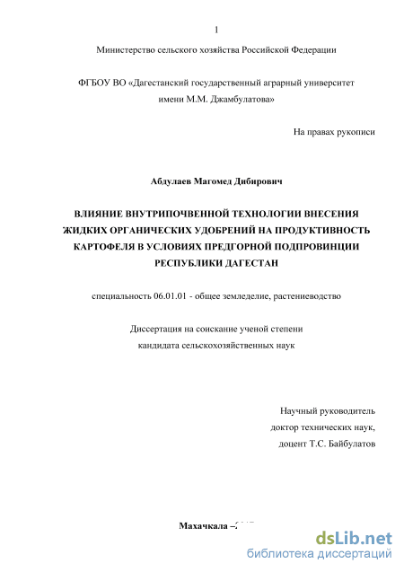 Актуальность темы исследования. Одним из приоритетных проектов развития Республики Дагестан является «Эффективный агропромышленный комплекс», в котором особое внимание уделено применению научно-обоснованных, экологически безопасных и ресурсосберегающих технологий производства сельскохозяйственных культур, в том числе и картофеля.