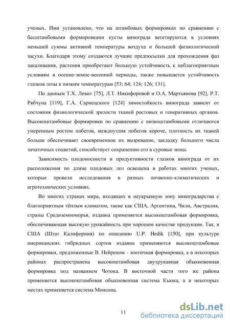 Исследования, проведенные Р.Т. Рябчуном [120] в условиях Дагестана показывают, что высокоштамбовые формировки способствуют получению высоких урожаев винограда (15-26 т/га). При этом такие показатели не являются пределом, т.к. реализованы не все потенциальные возможности широкорядной высокоштамбовой культуры. М.С. Кухарский [70] утверждает, что повышение высоты штамба от 40 до 160 см при формировке двуплечий кордон при нагрузке 55-62 глазка на куст и 39-45 побегов не способствует увеличению урожайности. Повышение урожайности происходит за счет улучшения показателей коэффициента плодоношения и плодоносности, средней массы грозди, а в отдельные годы за счет лучшей сохранности глазков. Предпочтение отдается высокоштамбовой (120 см) формировке со свободным расположением побегов в пространстве. Исследованиями В.Ф. Рыбина и др. [116] по комплексному изучению факторов, как высота штамба - 70-120 см, веерно-кордонной формировки, шириной ряда 3 м, расстоянием между кустами 1,25-1,75 см, длиной обрезки плодовых лоз на 2-4, 8-10 и 14-16 глазков и нагрузке в разных режимах показывают, что у сорта Рубиновый магарач формировка, схема посадки и высота штамба, при одинаковой нагрузке на единицу площади насаждений не оказывают существенного влияния на величину получаемого урожая.