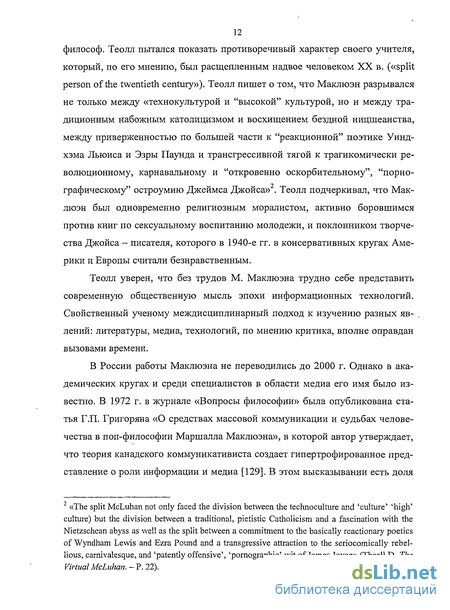 С начала 1990-х гг. в диссертационных исследованиях, посвященных проблемам массовых коммуникаций, труды Маклюэна, его идеи упоминаются достаточно часто. Так, в диссертационном исследовании O.P. Самарцева «Актуальные проблемы телевизионной журналистики в условиях современного этапа информационно-компьютерной революции» труды по массмедиа М. Маклюэна рассмотрены подробно, значительное внимание автор уделяет его теории тетрад. O.P. Самарцев упрекает канадского коммуникативиста в том, что тот слишком сосредоточен на технологических составляющих массмедиа, однако признает, что исследование современного телевидения и радио уже невозможно без опоры на труды Маклюэна [377, с. 17-19, 55-59, 78-84].