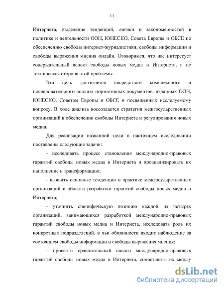 Исходя из поставленной цели и обозначенных задач диссертации, а также учитывая междисциплинарный характер работы, в основу методологии были положены такие методы познания, как анализ, синтез, сравнение, сопоставление, дедукция и обобщение. Основной акцент в работе был сделан на последовательном и сопоставительном анализе сущности международно-правовых гарантий свободы новых медиа и Интернета, а также на выявлении системных взаимосвязей между позициями межгосударственных организаций в области свободы информации и свободы выражения мнения в Интернете. Также использовался классификационный метод, предполагающий деление по отличительным признакам, и такие методы, как системный подход, формально-юридический и исторический анализ.
