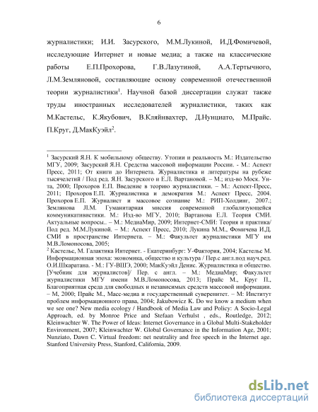 Л.М.Земляновой, составляющие основу современной отечественной теории журналистики5. Научной базой диссертации служат также труды иностранных исследователей журналистики, таких как М.Кастельс, К.Якубович, В.Кляйнвахтер, Д.Нунциато, М.Прайс. П.Круг, Д.МакКуэйл6.