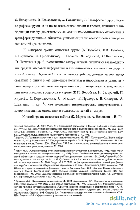 К четвертой группе относятся труды (А. Воробьев, В.В. Воробьев, Е. Вартанова, А. Грабельников, В. Горохов, Я. Засурский, С. Коновченко, Ю. Нисневич и др. ), позволившие автору уяснить специфику взаимодействия средств массовой информации и коммуникации с органами государственной власти. Отдельный блок составляют работы, дающие четкое представление о синкретизме феноменов политики и информации в развитии -политизации российского информационного пространства и медиатизации политических процессов в стране (В.П. Воробьев, И. Засурский, П. Киричёк, С. Корконосенко, С. Маслюк, Е. Прохоров, В. Сидоров, А. Шевченко и др. 3), что позволяет интроецировать информационно-коммуникативные отношения в политологический дискурс.