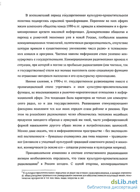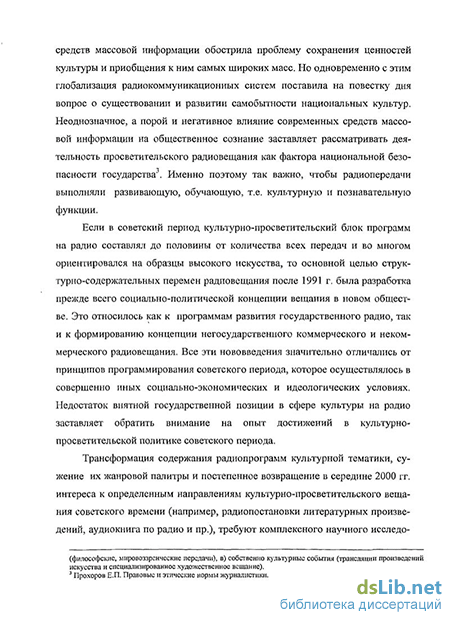 Однако при достаточном количестве публикаций о радиовещании как отечественных, так и зарубежных авторов, а это большое число монографий и работ, посвященных различным проблемам радио8, в них практически не анализируется культурно-просветительская функция радио. Но не подлежит сомнению то, что эта тема нуждается в особом, серьезном исследовании. Не только потому, что в последние годы были утрачены многие научные традиции работы с таким материалом. Главное заключается в необходимости вписать традиции в процесс формирования современной культуры, которая сегодня во многом основывается на принципах конкуренции и свободы: свободы слова, свободы обмена идеями, свободы выбора и доступа, свободы торговли, свободы творчества . Значение радио, особенно государственного, в этом процессе не стоит преуменьшать.