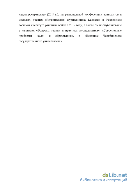 «Журналистика в 2012 году: социальная миссия и профессия», на Международной конференции «Журналистика в 2013 году: регионы в российском медиапространстве» (2014), на Региональной конференции аспирантов и молодых ученых «Региональная журналистика Кавказа» в РАУ в 2012 г., на заседании кафедры теории и истории журналистики Российско-Армянского университета.